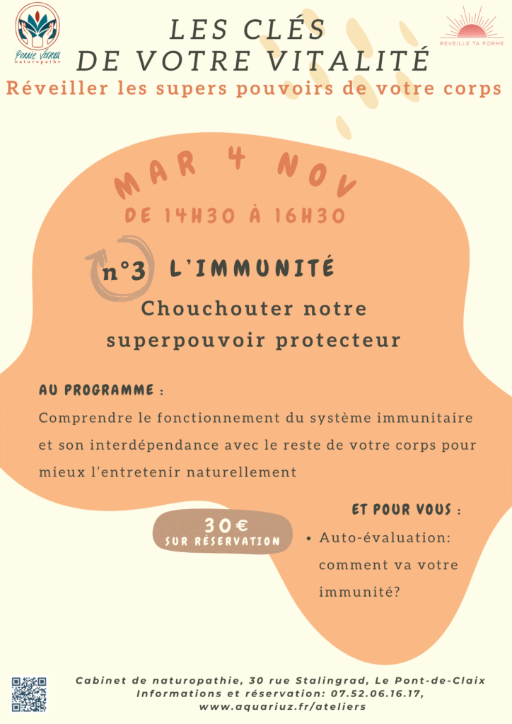 Ce deuxième atelier vous donnera les clés pour adapter vos activités physiques ou sortir de la sédentarité avec plaisir, afin de profiter des bienfaits irremplaçables du mouvement jusqu’au cœur de vos cellules. - Atelier n°3: L’IMMUNITE – Chouchouter votre superpouvoir protecteur